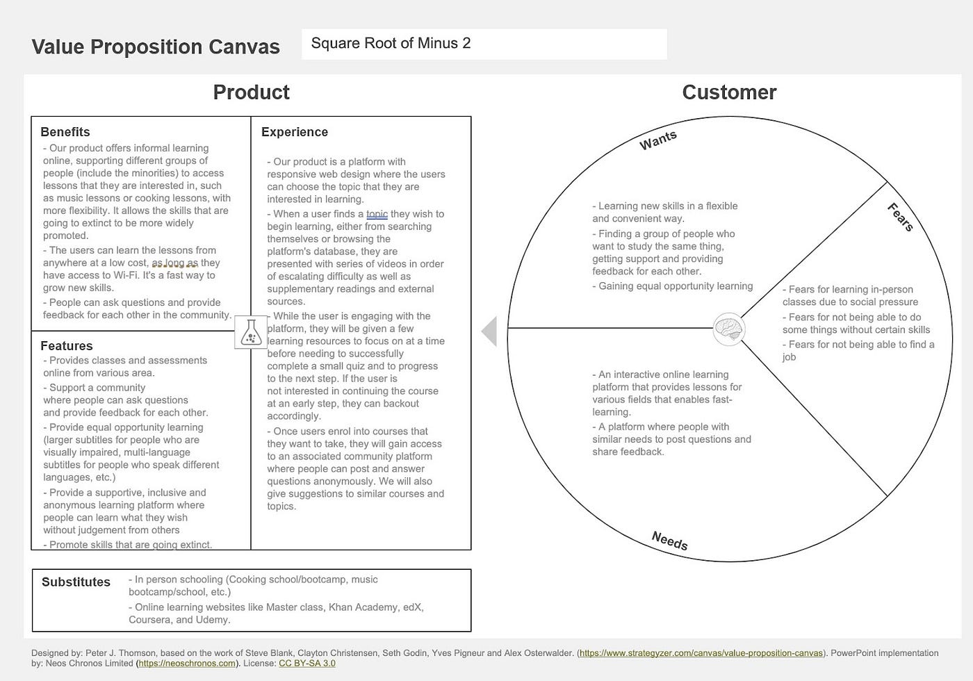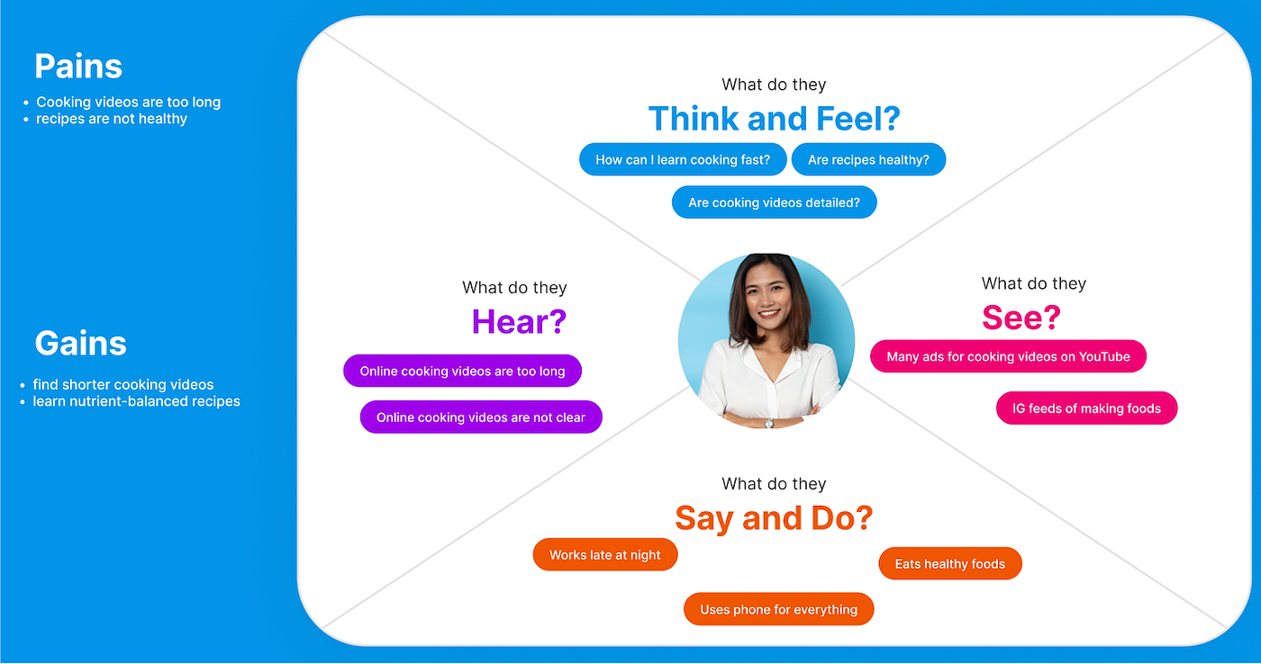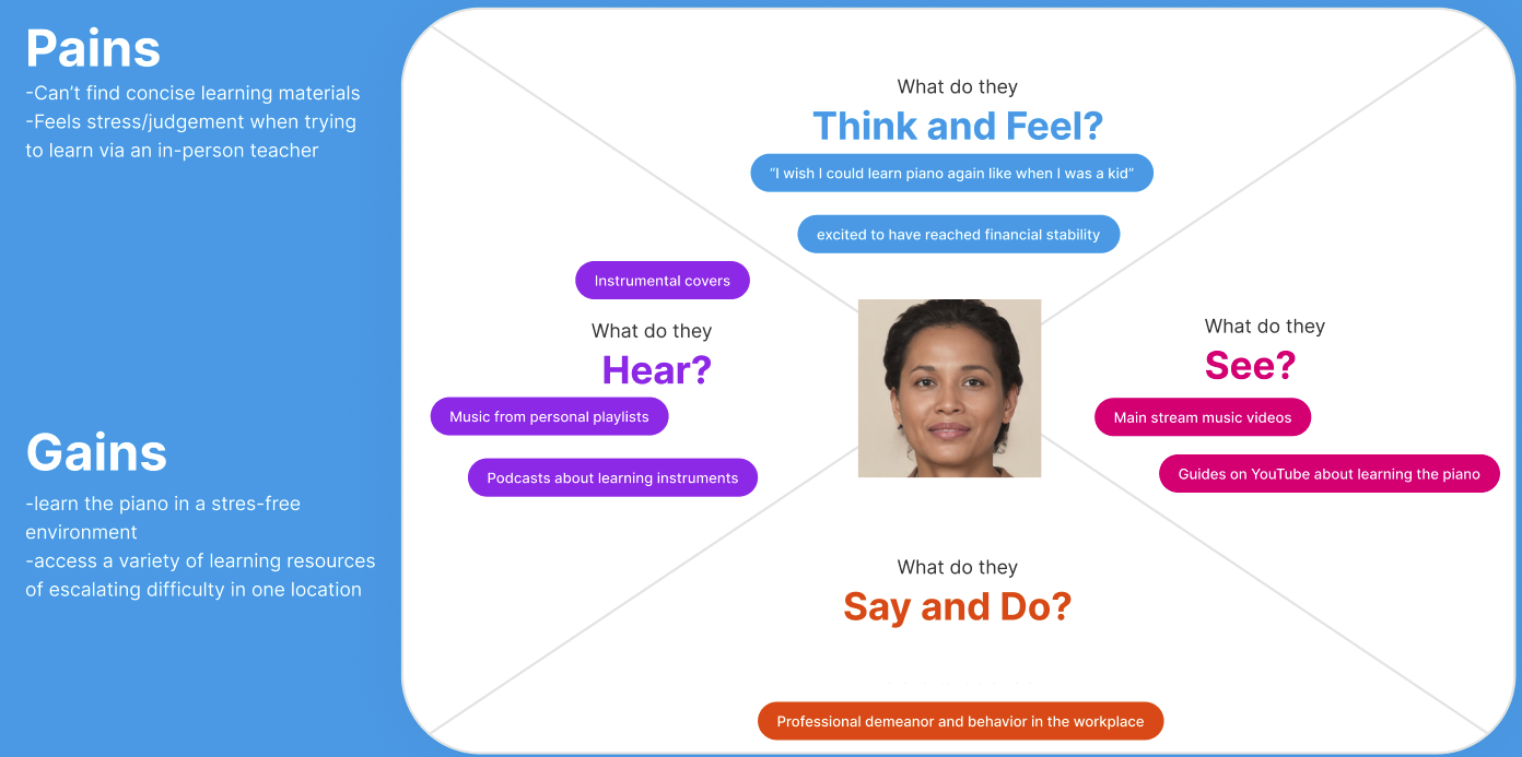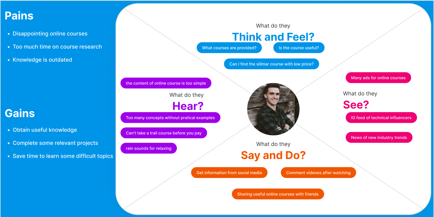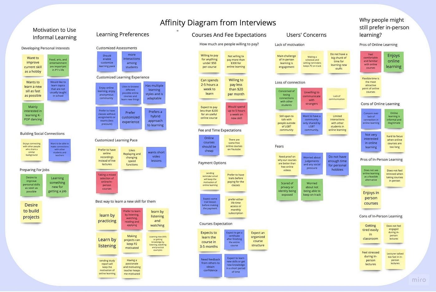 After conducting thorough research and analyzing existing solutions, our team embarked on the empathy stage to better understand our user group’s pain points and desires. Through the value proposition activity, we discovered that our unique selling point is to enhance the benefits of informal learning, which allows users to learn at their own pace in a judgment-free environment. In contrast to a traditional classroom setting, informal learning will enable students to learn without the constraints of a schedule and the social pressure that accompanies in-person learning. Additionally, we identified that some users fear losing track of their learning progress and becoming overwhelmed by the amount of information available.