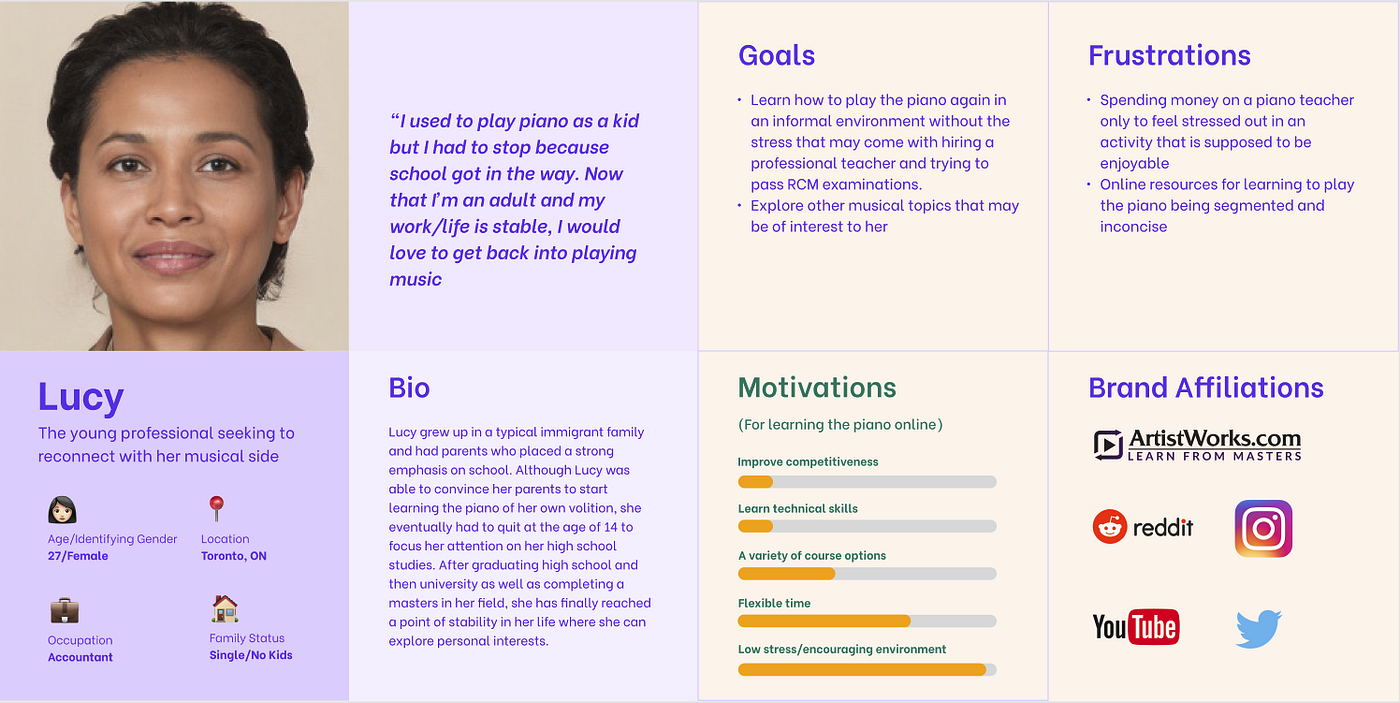Lucy is a 27-year-old working professional with the time and money to pursue hobbies that she may have put aside for her career. She represents the demographic of adults who have been in the workforce for several years and have progressed in their careers. Regarding learning on our platform, Lucy may be interested in courses that can help her advance her career or improve her skills in a hobby. She may prefer classes that are delivered in a structured format and allow for timely communication with the instructor.