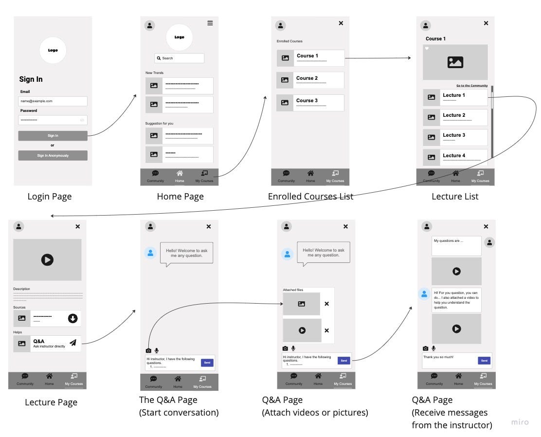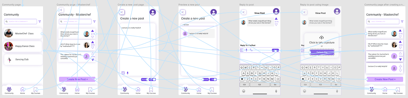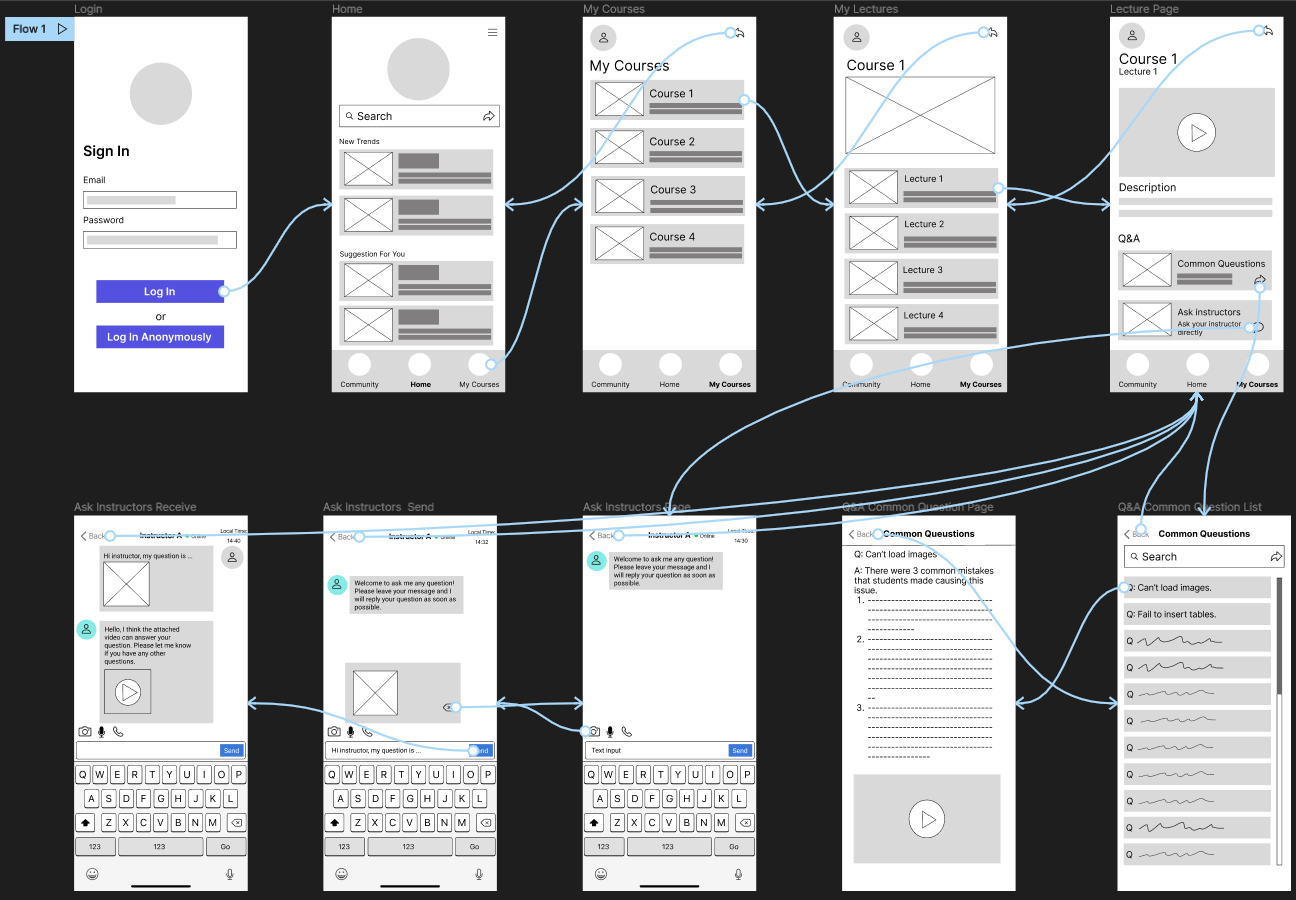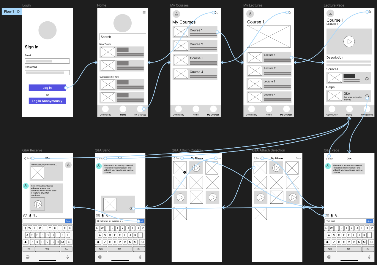 Our team chose to prototype the community user flow and the Q&A user flow since we thought that these two features were the key differentiators of our app from other existing solutions. During our empathy stage, we noticed that a lot of users’ concerns are related to losing connections with other peers and not being able to ask questions in a timely manner. While existing solutions offer features such as a recommendation system, most do not include a community and Q&A feature.