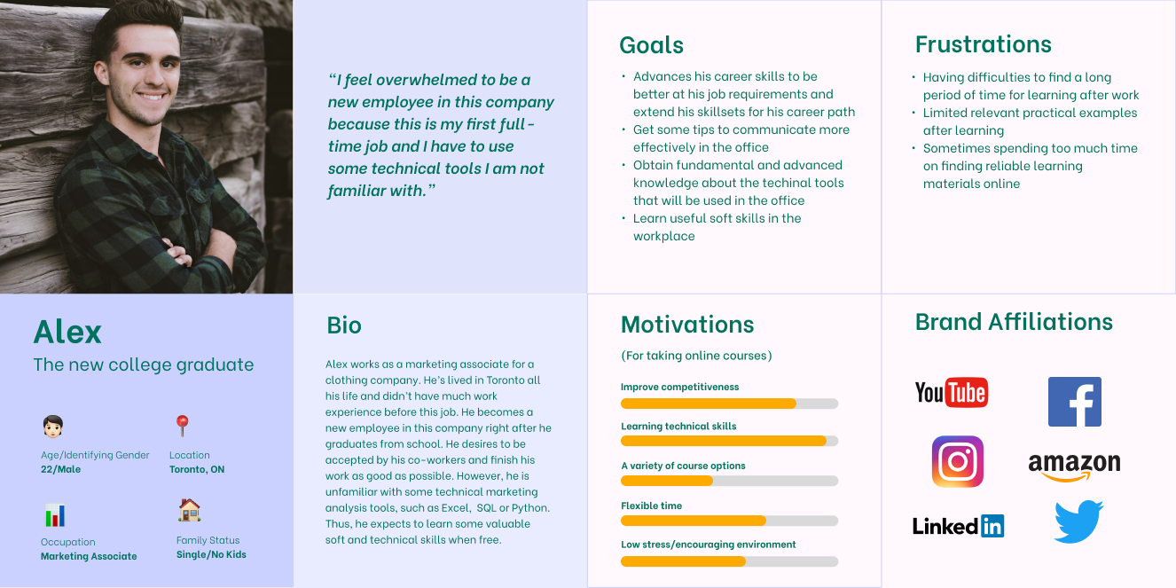 Alex is a 22-year-old college graduate looking to learn and enhance technical skills for the workplace. He represents individuals just starting their careers and looking for resources to support them. Alex may be interested in courses on our platform that can help him advance practical skills relevant to his field of work and extend his skillsets for his career path. He may prefer concise courses that offer a certificate or recognition upon completion.