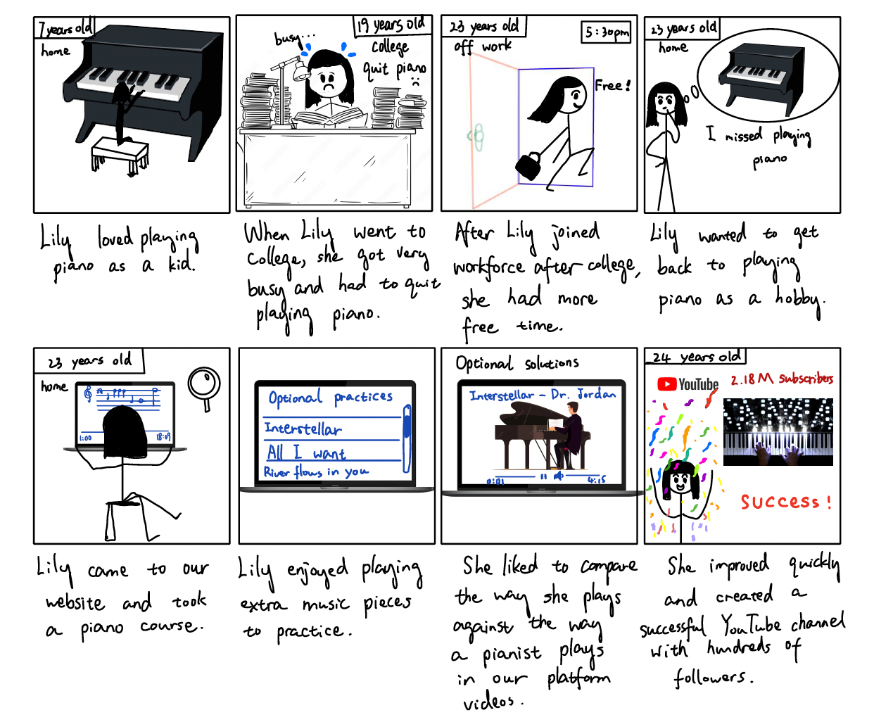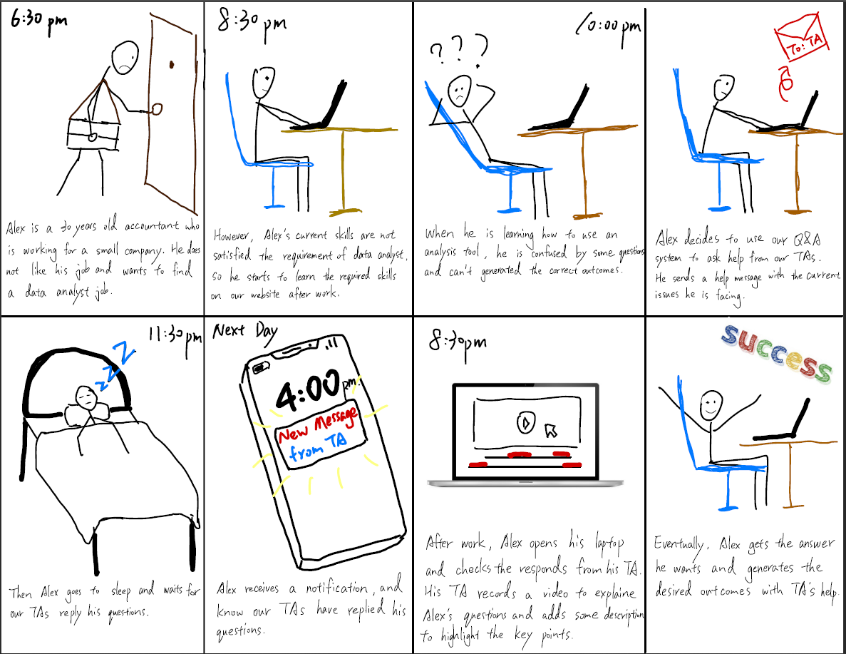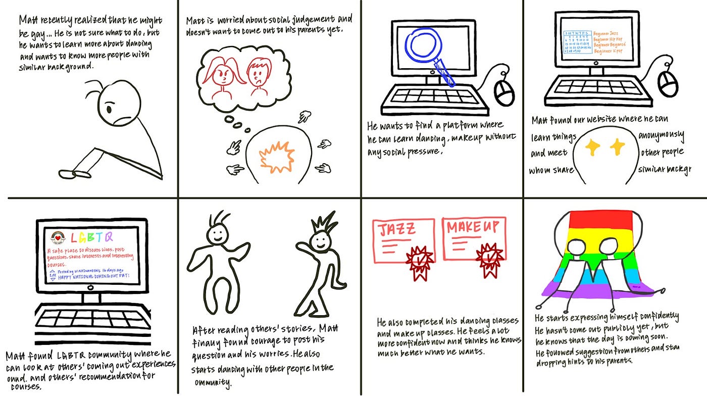 Our team then created storyboards to represent user stories associated with these features to gather more insights about user needs, how our product can solve their dilemma, and how we can refine key features.